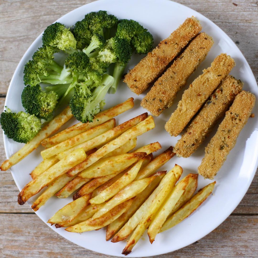 Bastones de tofu con patatas y brócoli. Una combinación perfecta de proteínas vegetales y carbohidratos saludables. ¡Riquísimo! Tiempo extra: Marinar 3 horas