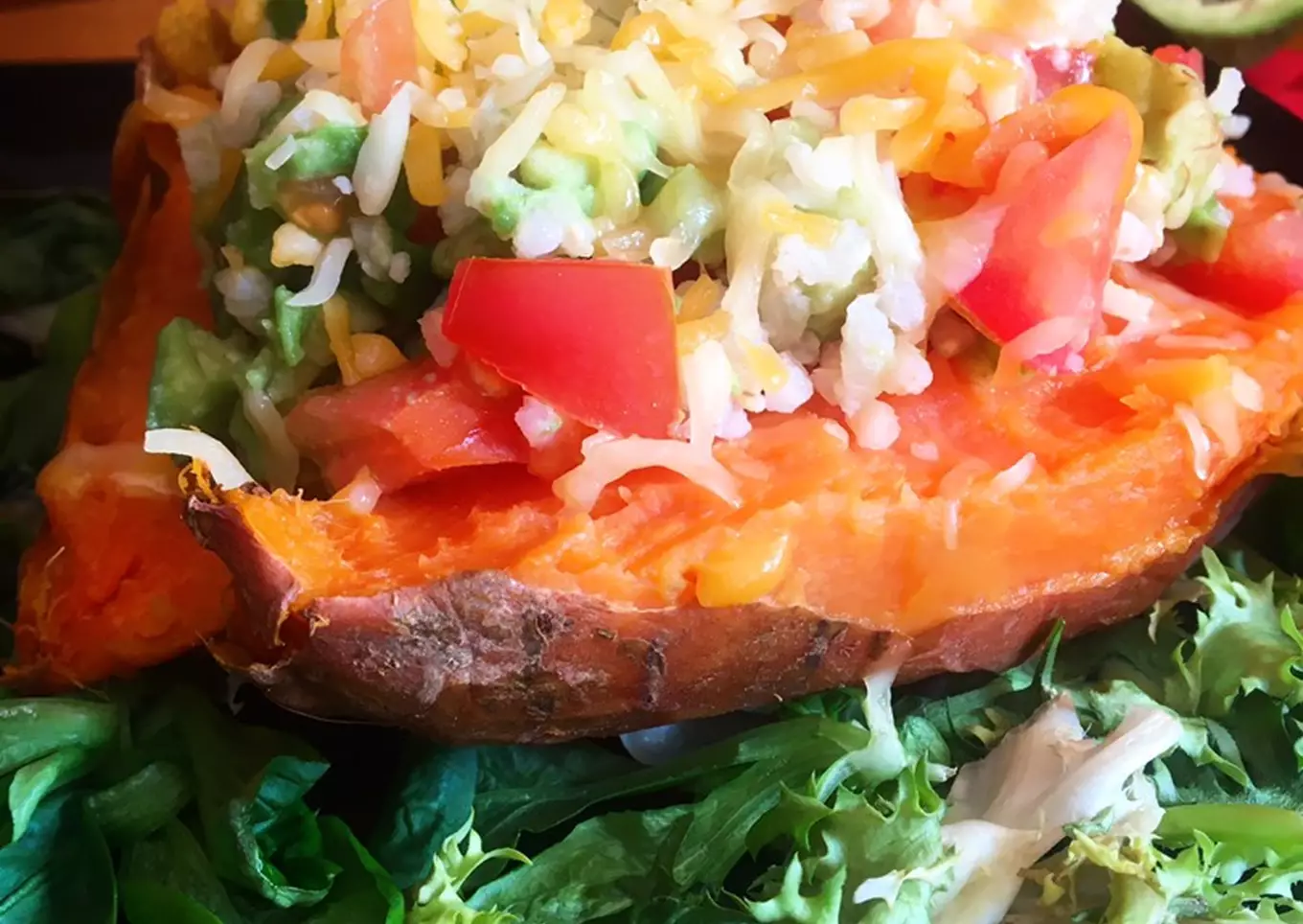 Batata rellena de ensalada de arroz. Un plato equilibrado y sabroso, ideal para una comida saludable que no compromete el gusto ni la originalidad. ¡Delicioso!