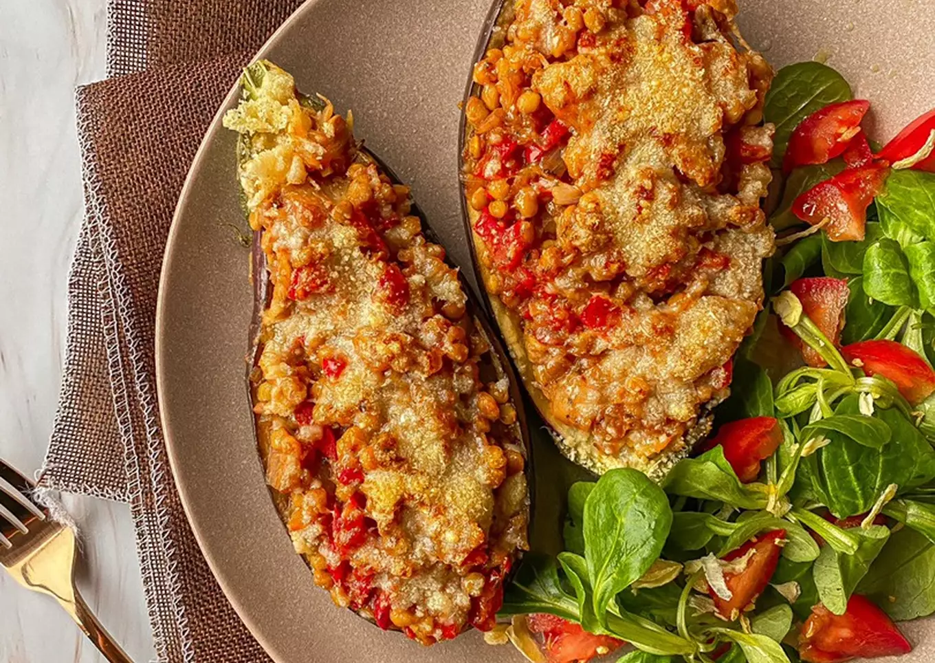 Berenjena rellena de boloñesa de lentejas, una alternativa vegetariana al plato tradicional. Rellena de sabor y nutrientes, es ideal para una comida saludable.