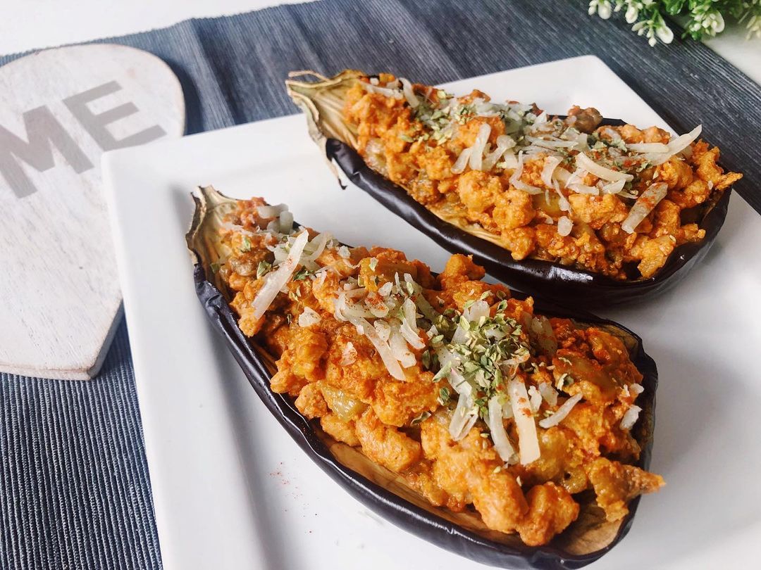 Berenjenas rellenas de soja texturizada, una comida repleta de sabor y nutrientes. Reconfortante al combinar texturas y sabores. ¡Rica y rápida de preparar!
