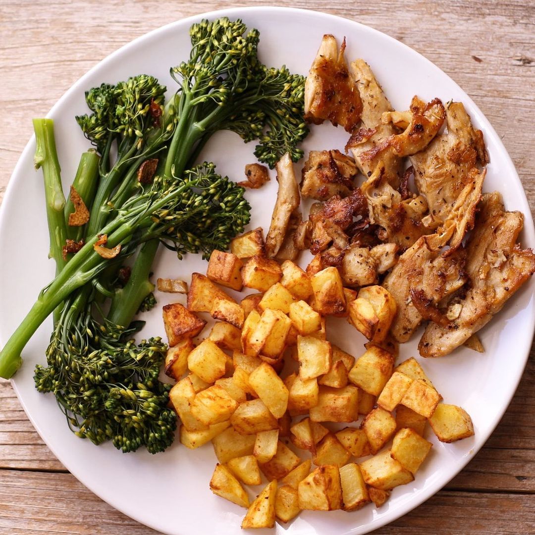 Bocados de Heura con patatas y bimi, una combinación perfecta de proteínas vegetales, carbohidratos y verduras. Un plato delicioso y nutritivo. ¡Está delicioso!