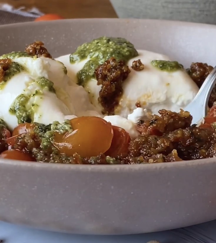 Burrata con cherrys asados y pesto, una combinación sublime de sabores y texturas. Ideal para una cena especial o deleitar a tus invitados con un entrante.