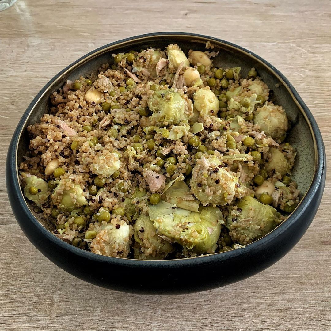 Corazones de alcachofa con guisantes, quinoa y atún