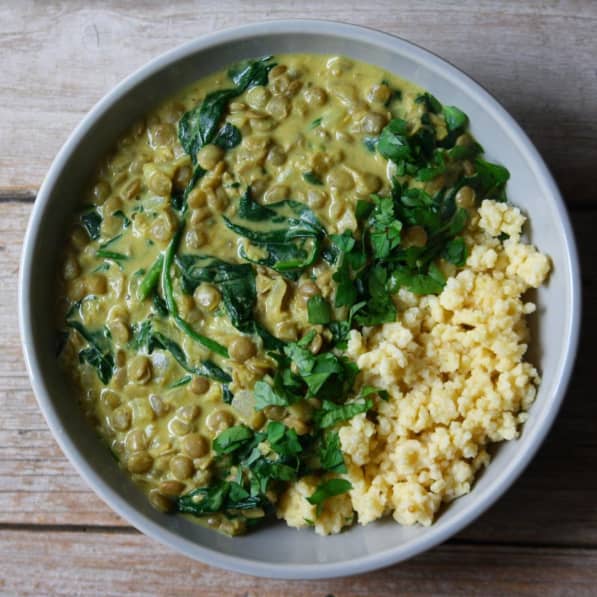 Curry Thai de lentejas y espinacas, acompañado de mijo, una combinación perfecta de nutrición. ¡EStá delicioso, debes pruébalo, si! Tiempo extra 120 minutos