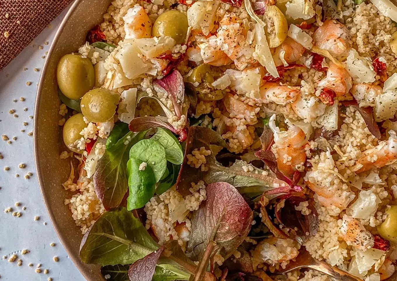 Ensalada de canónigos, cous cous y langostinos, perfecta para una cena. Una combinación equilibrada de ingredientes frescos y sabores delicados. Lleno de sabor