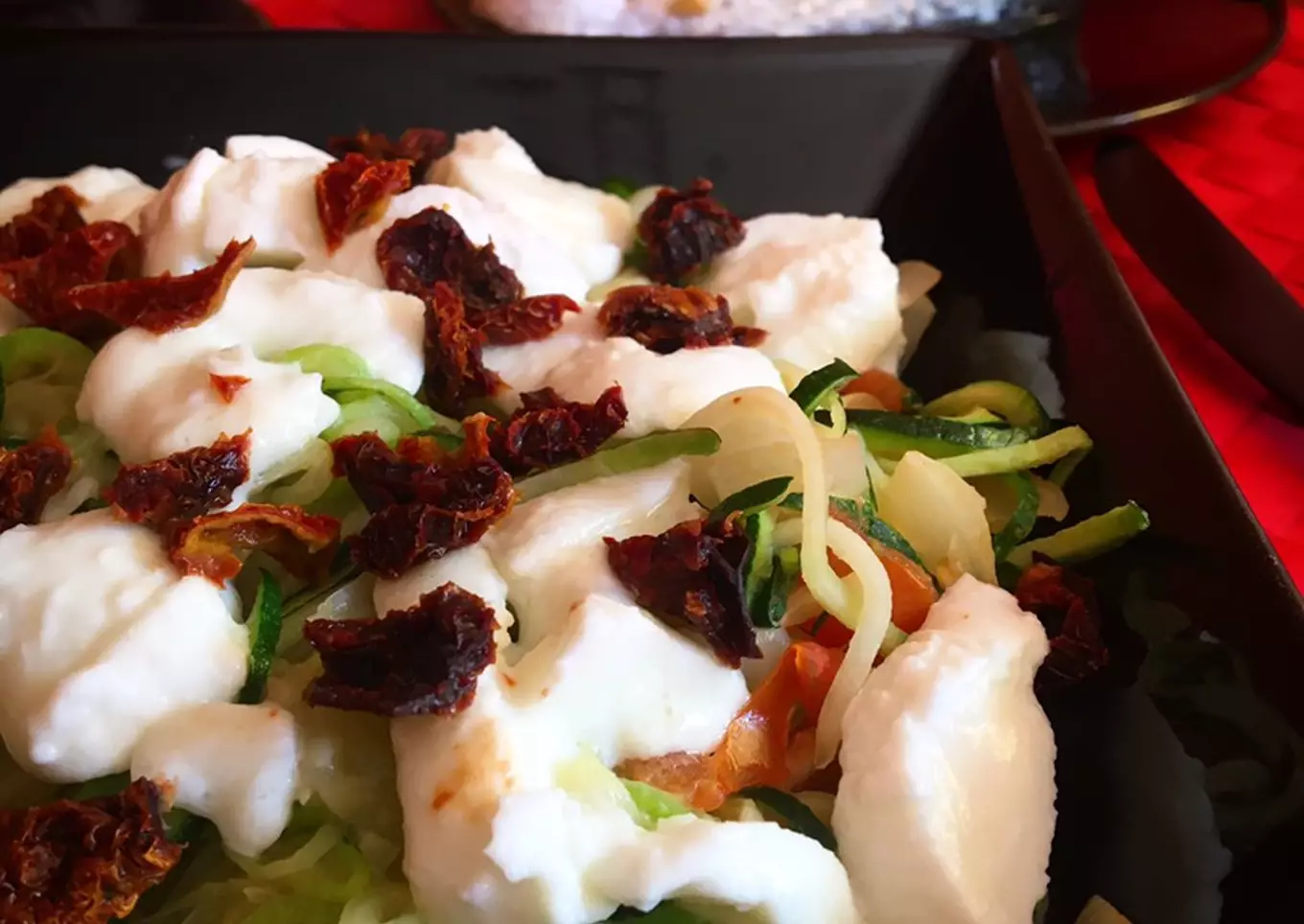 Espaguetis de calabacín con mozzarella y salmón, una combinación perfecta de sabores frescos y delicados. Ideal para una cena rápida y sana. ¡Está riquísima!