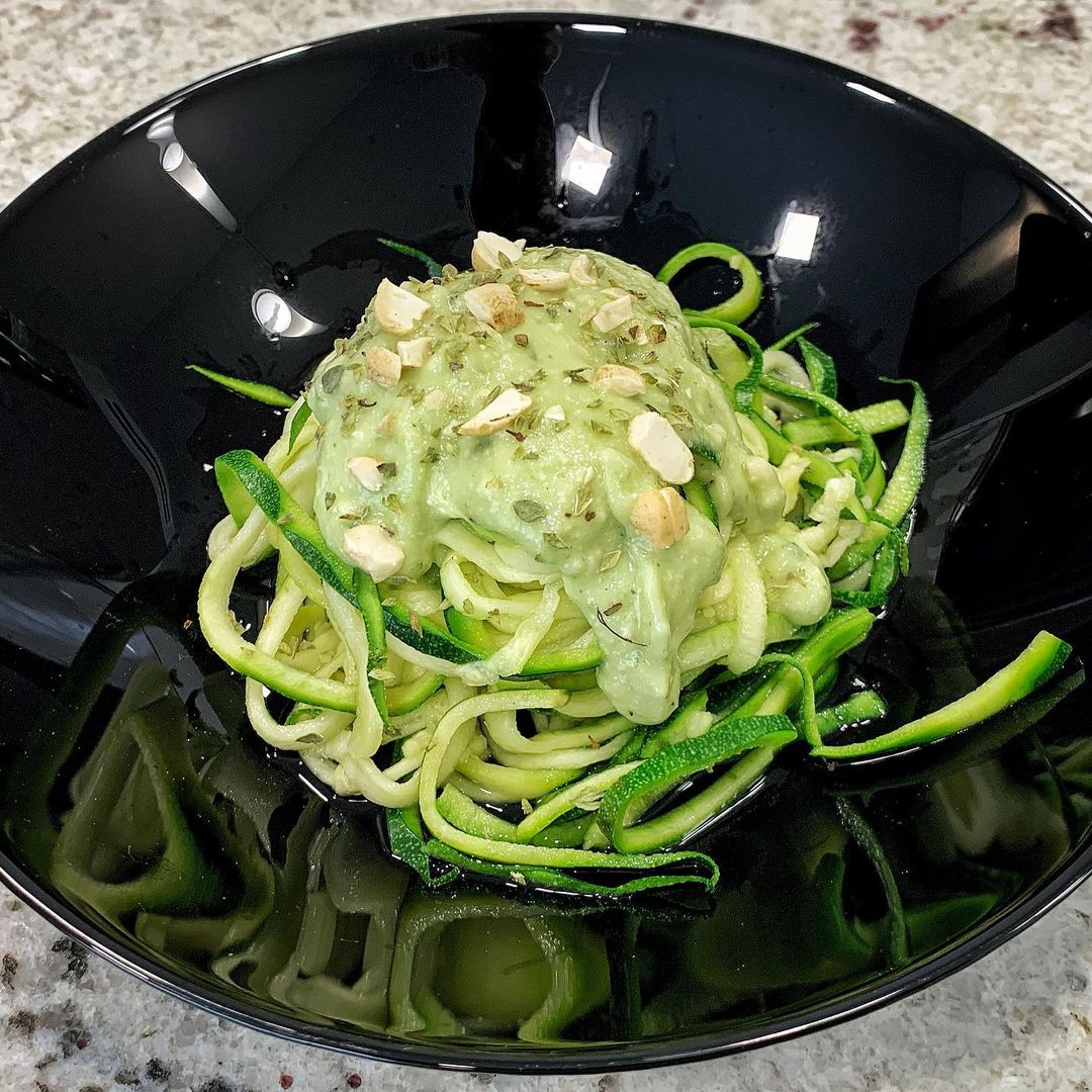 Espaguetis de calabacín con salsa de aguacate. Otra forma de comer verdura de forma divertida y sabrosa. La salsa de aguacate y los anacardos le dan su toque.