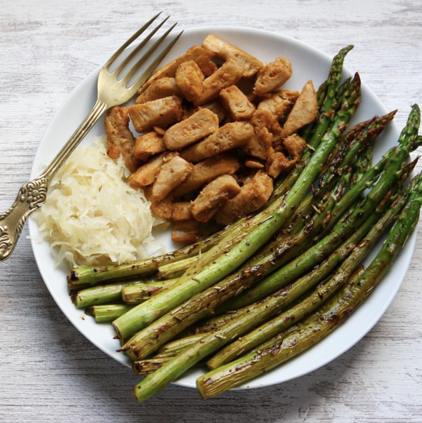 Espárragos con Heura y chucrut, un plato que combina la frescura de los espárragos, la riqueza de Heura y la acidez del chucrut para una experiencia única.