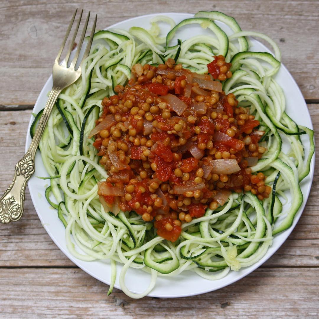 Fideos de calabacín con boloñesa de lentejas