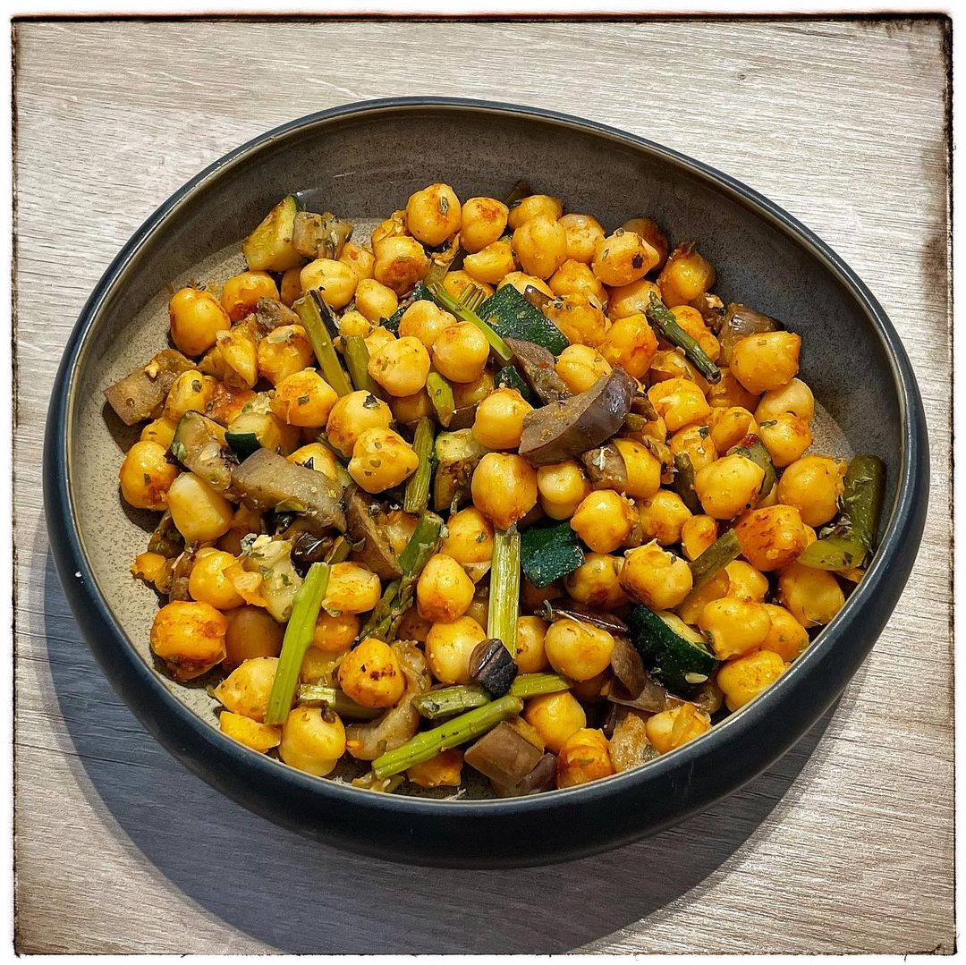 Disfruta de unos garbanzos con verduras y pimentón. Un plato nutritivo que combina lo mejor de la huerta . Perfecto para una comida reconfortante y saludable.