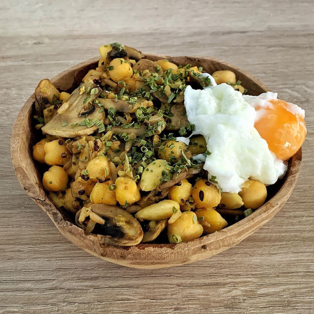Garbanzos exóticos con champiñones, cereales y huevo