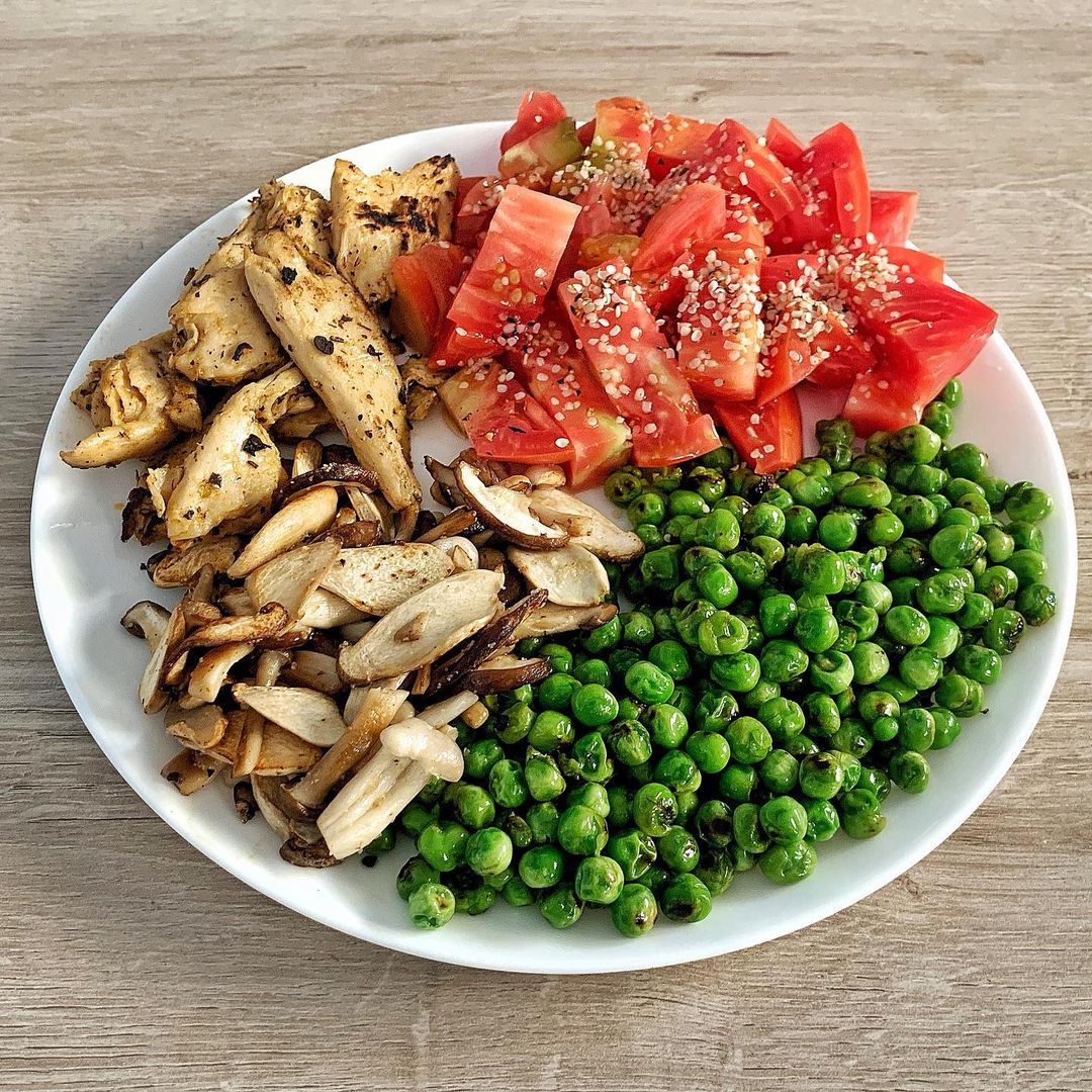 Guisante con setas, heura y tomate