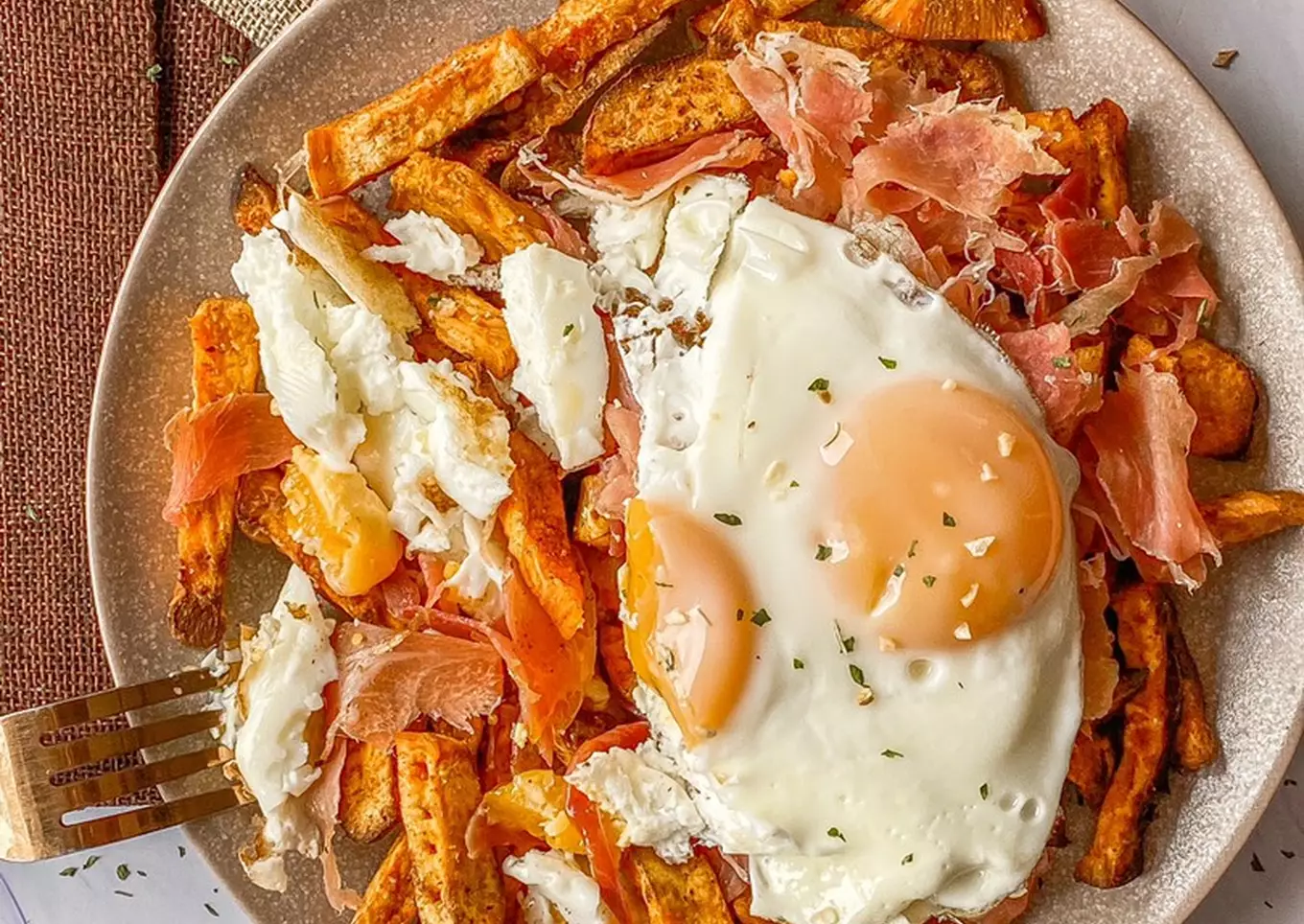 Huevos rotos de batata con jamón, una reinterpretación del tradicional plato español. Una combinación perfecta de dulce y salado para una comida inolvidable.