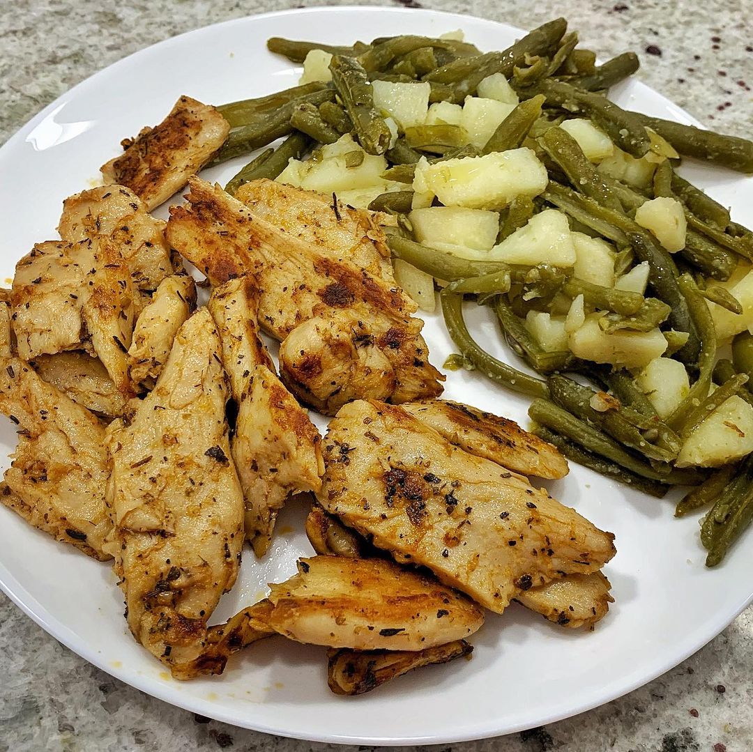 Retirar y servir las judías acompañadas de los bocados de heura.