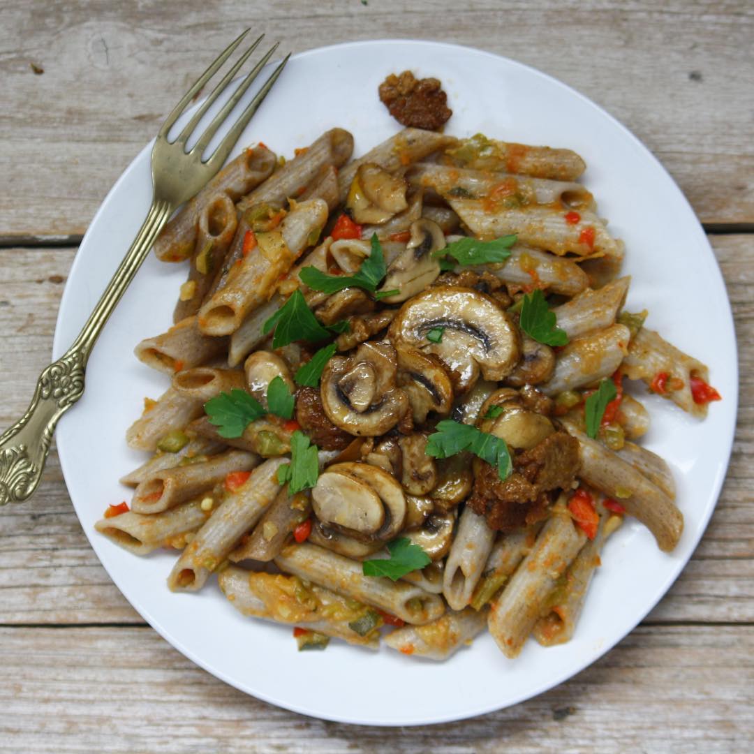 Macarrones con champiñones y chorizo vegano