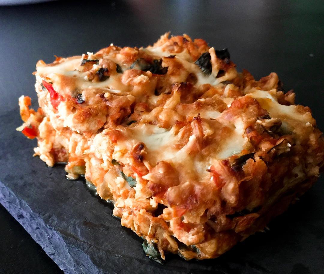 Cubrir la base de las berenjenas con la mitad de la mezcla de verduras y atún. Extender con la ayuda de una cuchara toda la salsa y repartir por toda la base.