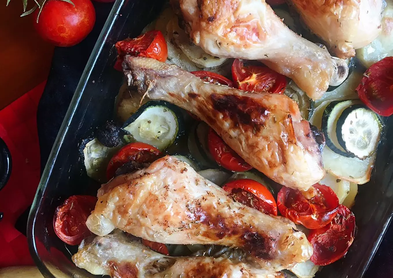 Muslos de pollo al horno con calabacín, patatas y tomate