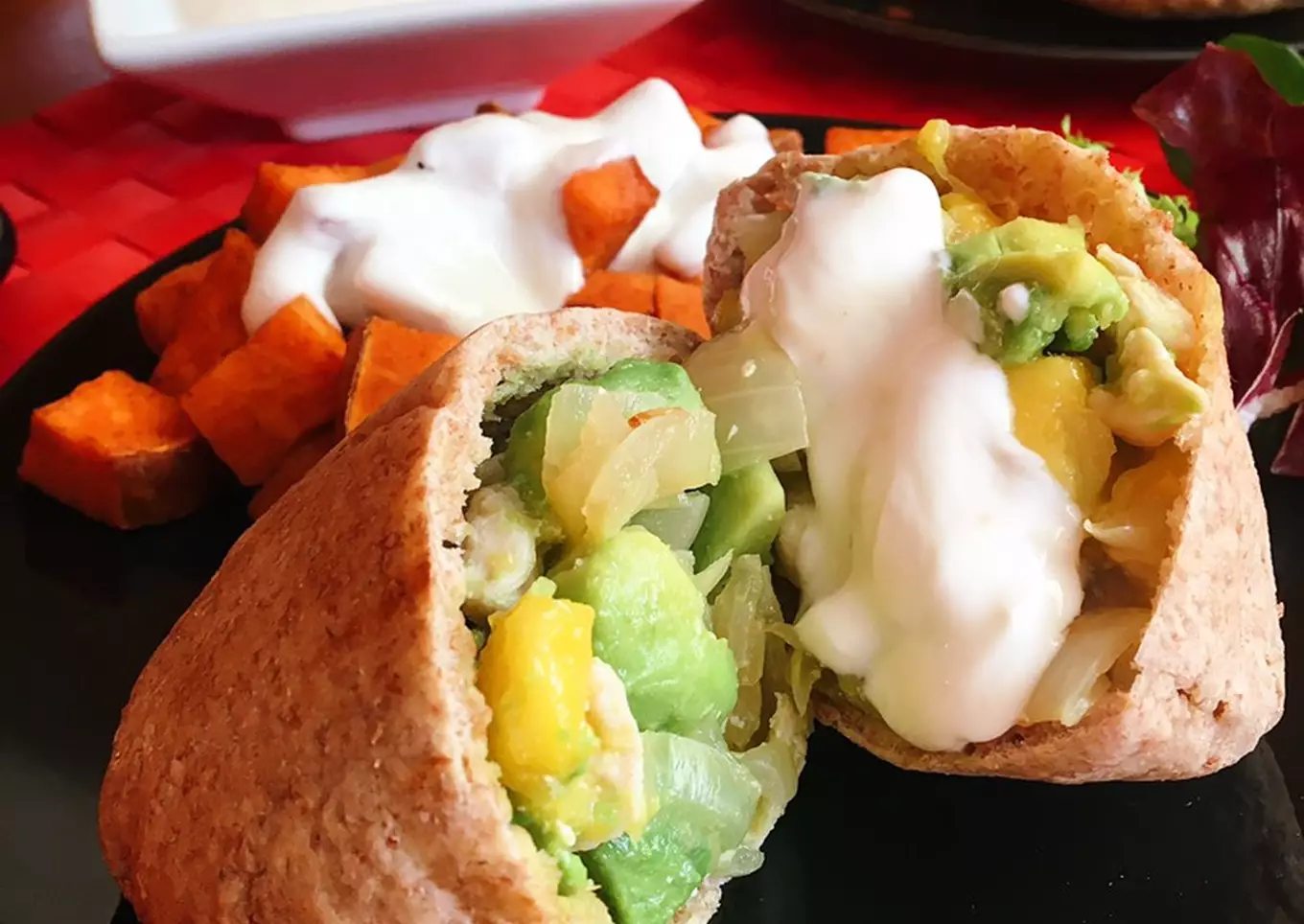 Pitas integrales de pollo con mango, aguacate y salsa de yogur