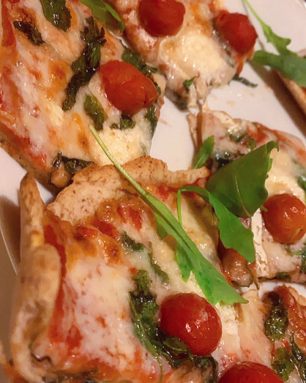 Retirar la pizza del horno y añadir la rúcula por encima.