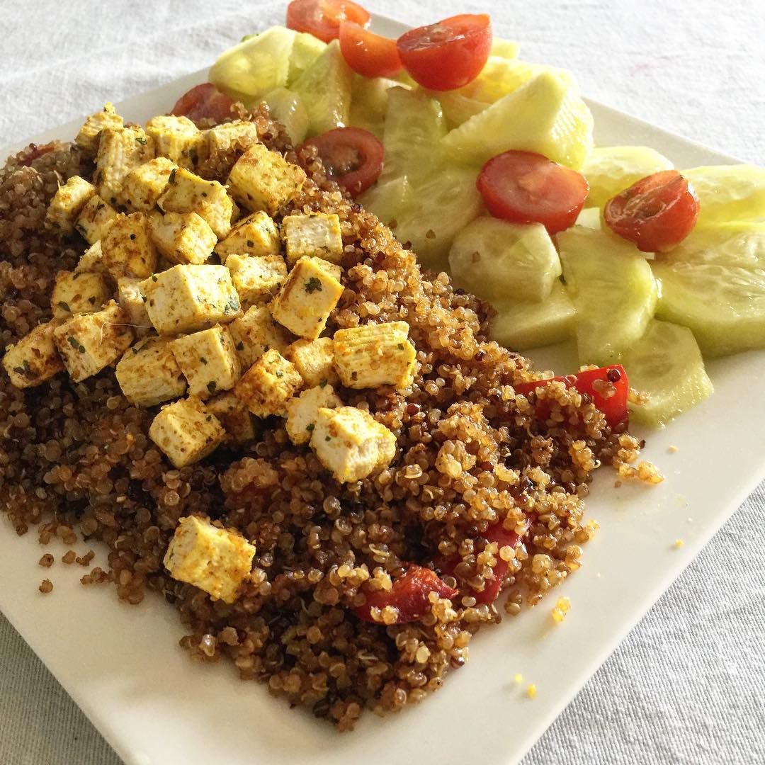 Quinoa con tofu y ensalada de pepino, un plato equilibrado y sabroso, perfecto para nutrir tu cuerpo y deleitar tus sentidos de manera saludable. ¡Riquísimo!