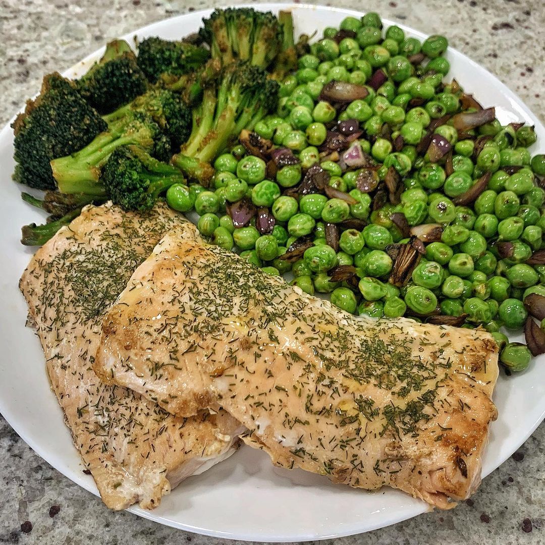 Salmón con brócoli y guisantes