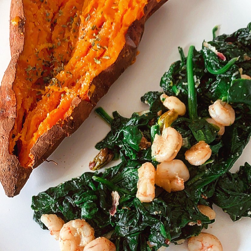 Salteado de espinacas con gambas y batata