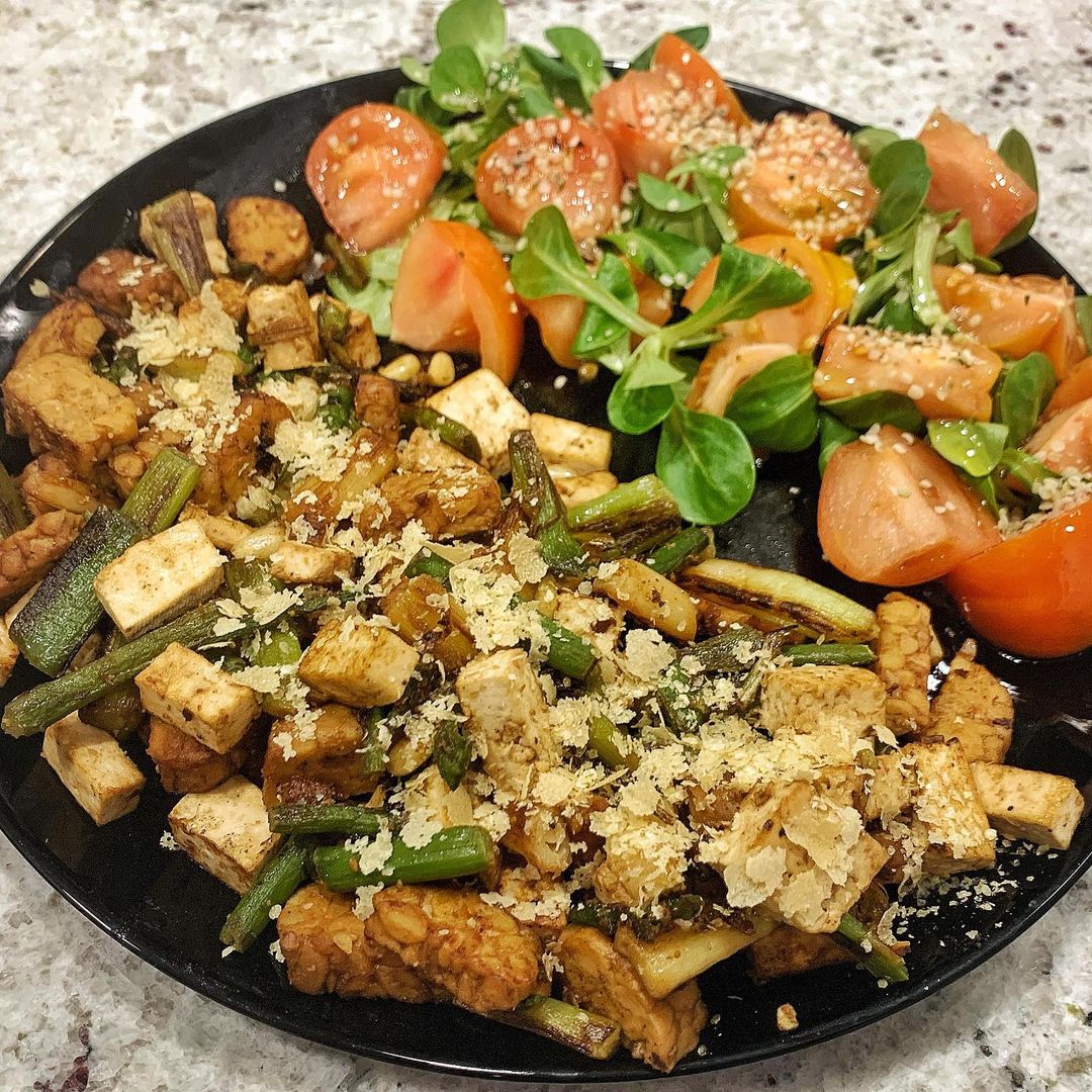 Disfruta de un plato completo y saludable con un salteado de verduras con tempeh y tofu. Alto en proteínas y bajo en calorías. Ideal para una dieta saludable.