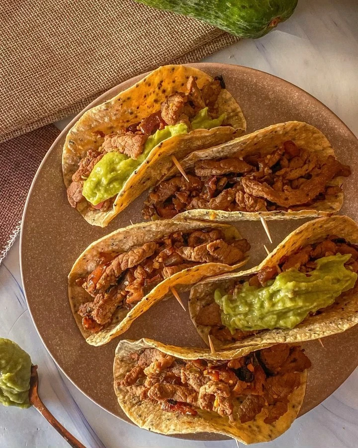 Tacos de carne, una deliciosa combinación de jugosa carne, cebolla y aguacate. Ideales para una cena rápida y llena de auténtico sabor. ¡Están increíbles!