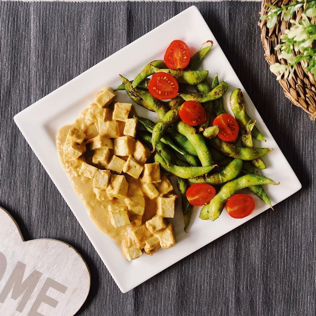 Tofu al curry con edamames, una combinación perfecta de especias aromáticas y la frescura de los edamames. Una comida que no sacrifica sabor por nutrición.