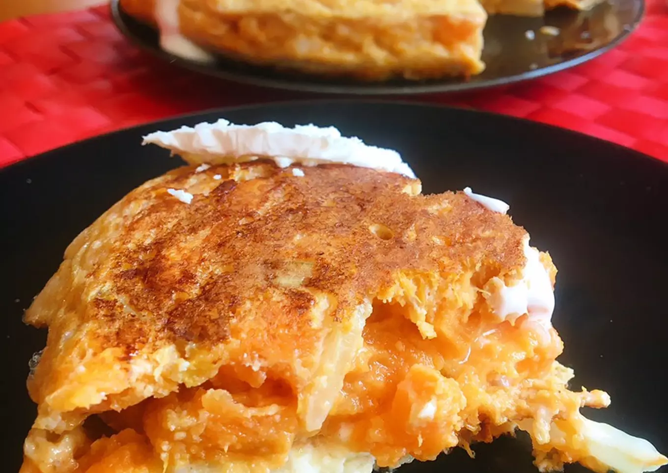 Tortilla de batata y rulo de cabra, un plato que combina la dulzura de la batata con la cremosidad del queso de cabra. Ideal para sorprender y comer diferente.