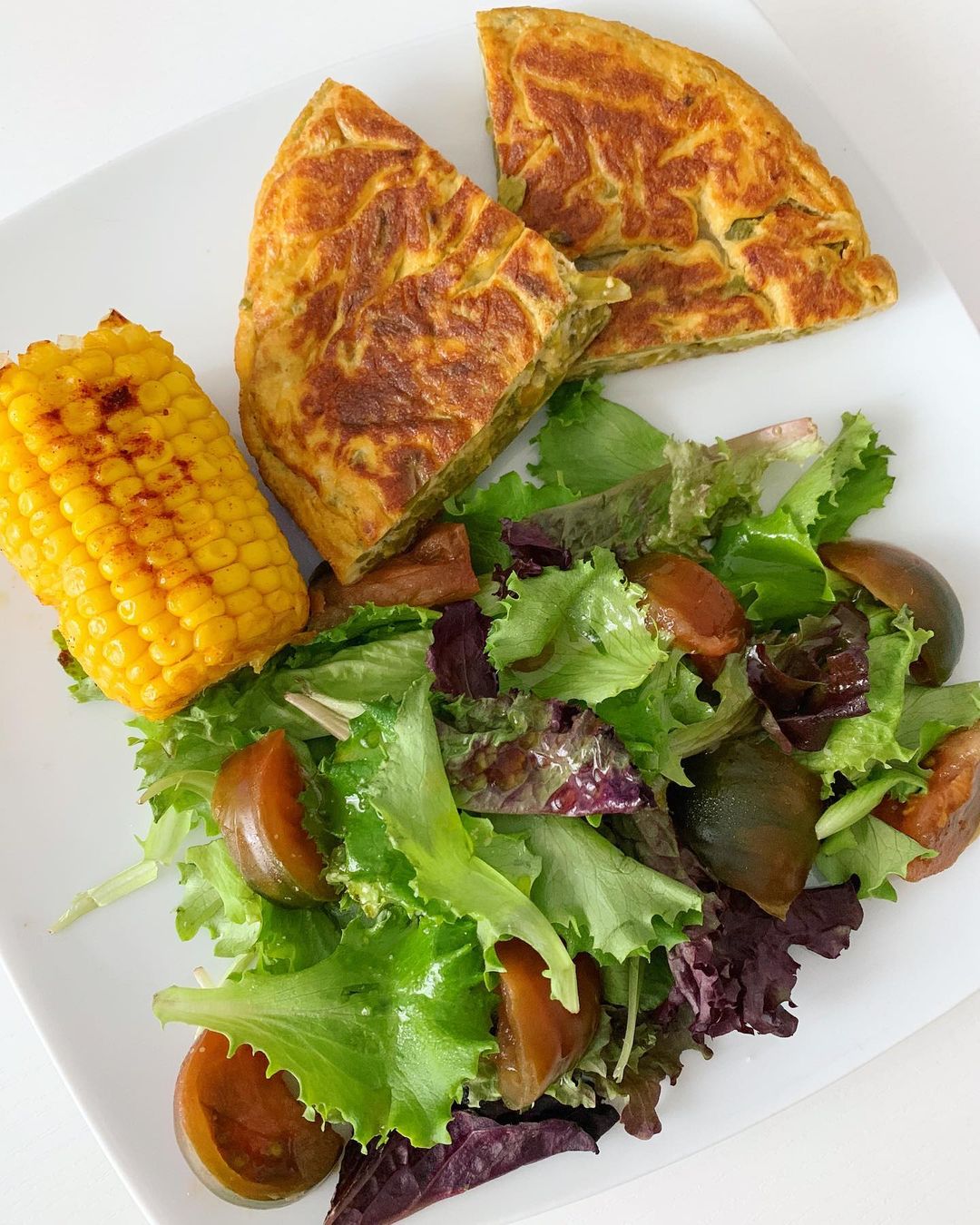 Tortilla de pimientos y espárragos con una ensalada. Un plato lleno de vitaminas y sabor, ideal para un almuerzo saludable o una cena rápida y deliciosa.